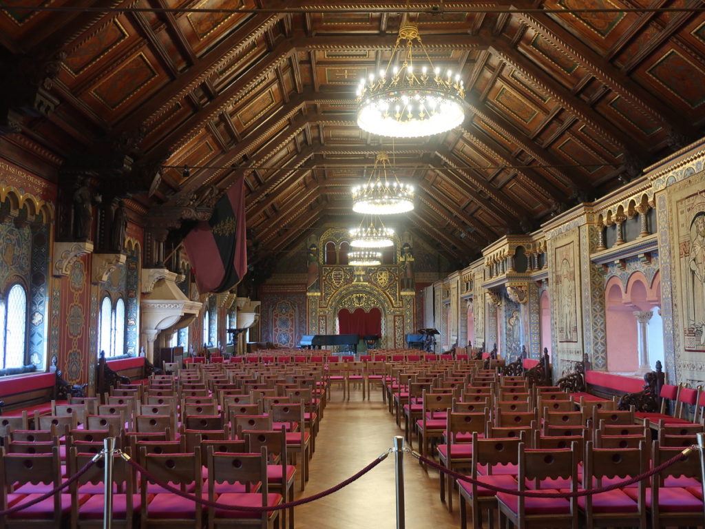 ドイツの城といえば、ノイシュバンシュタイン城を筆頭にホーエンツォレルン城、エルツ城といった外観の美しい城が人気ですが、ヴァルトブルク城の歴史的・文化的価値はこれらとは比べ物になりません。特に重要なのは、宗教改革を唱えたルターが身の危険から逃れるために隠れ、聖書を翻訳した場所であるということです。ラテン語で書かれていた聖書を庶民でも読めるようにドイツ語翻訳したことで、ルター聖書が普及し、現代ドイツ語にも大きな影響を与えたと言われています。また、奉仕活動に尽力した聖女エリザベートが嫁いだこと、ワーグナーのオペラ「タンホイザー」の題材となった歌合戦が行われた場所であることでも知られています。エリザベートの間や祝宴の間等はガイドツアーでのみ見学できます。ヴァルトブルク城はアイゼナハ(Eisenach)というドイツ中部の街にあり、バッハの家、ルターの家、ワーグナー博物館等もあります。